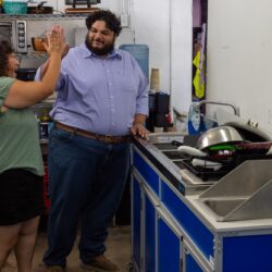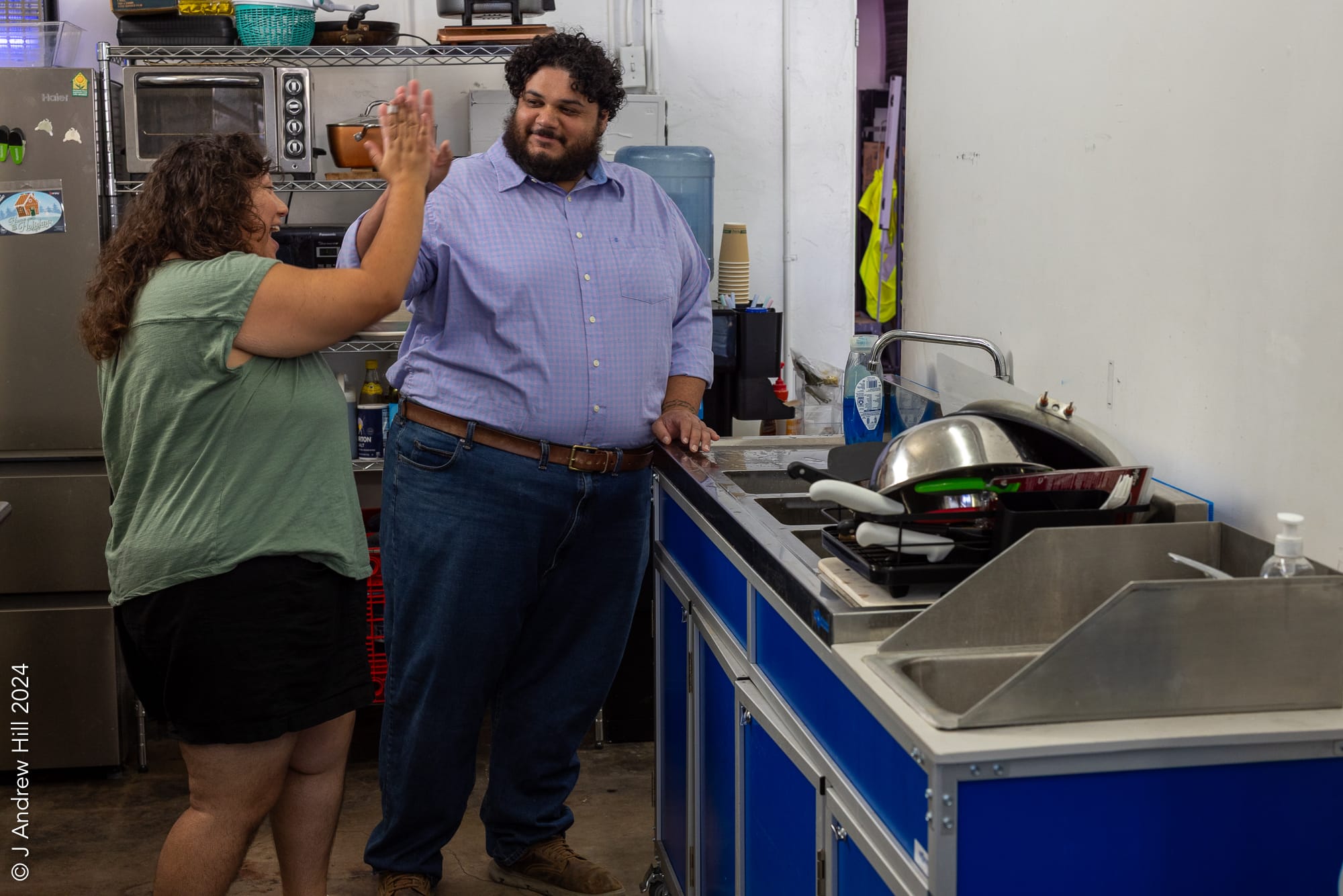 Sierra Doehr and Danial Chavez celebrate a clean kitchen area after processing micro greens and baby lettuces with their industrial salad spinner.